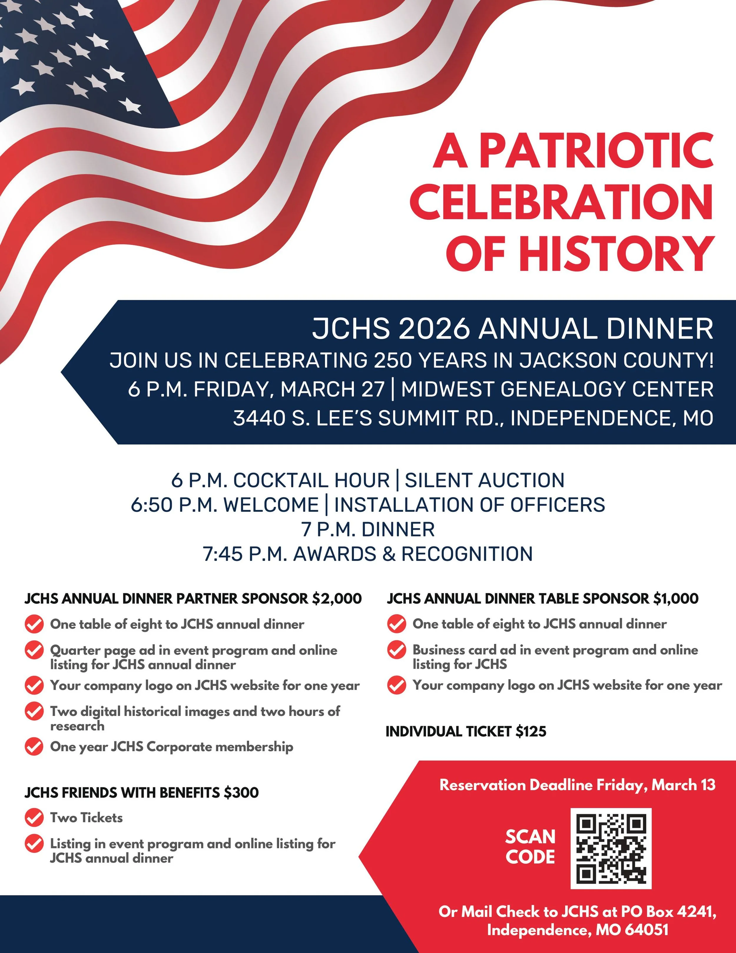It’s time for “A Patriotic Celebration of History” at the 2026 Jackson County Historical Society Annual Dinner, to be held at the Midwest Genealogy Center in Independence, MO.