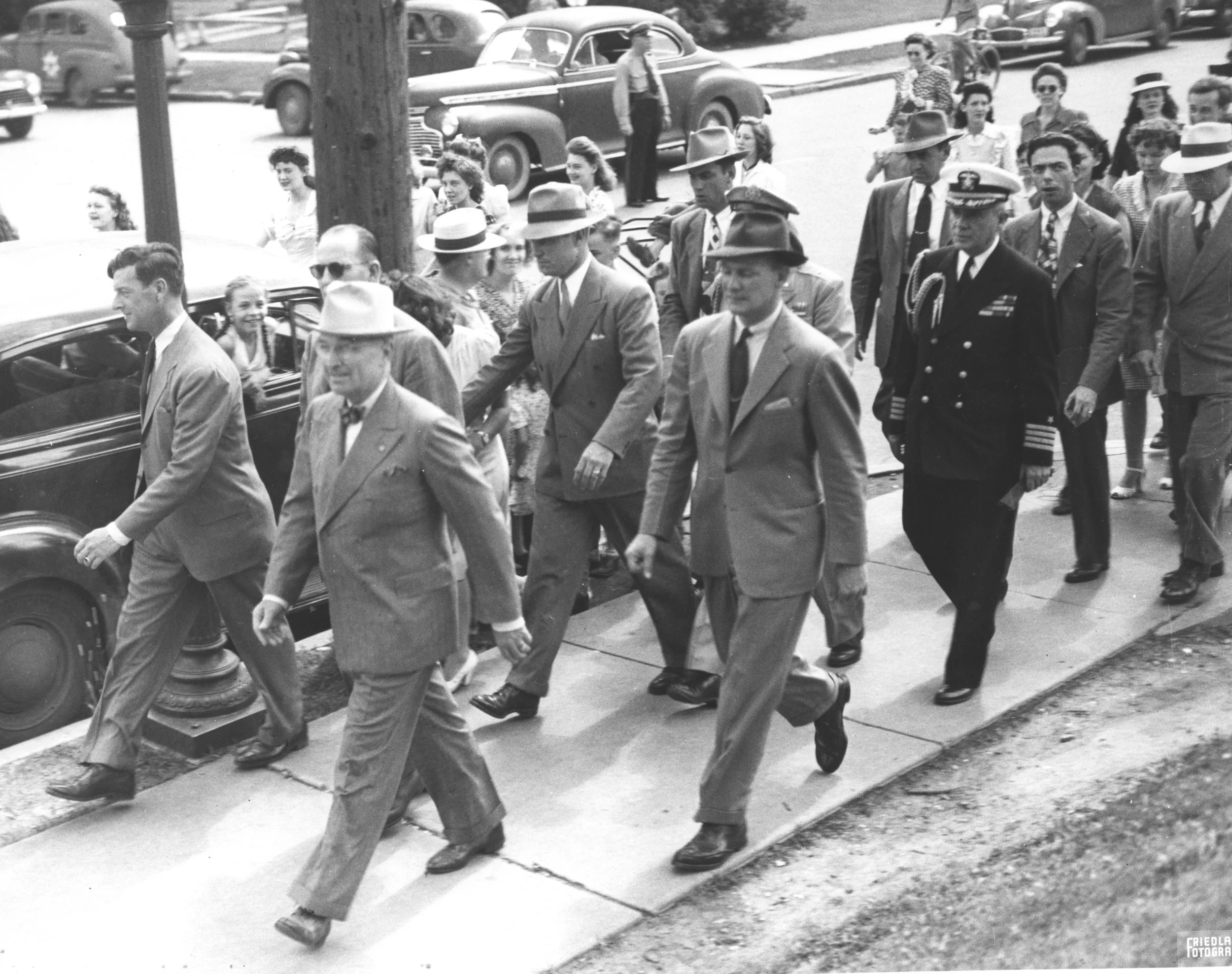 Harry and Bess Truman emerged from the car and were immediately surrounded by